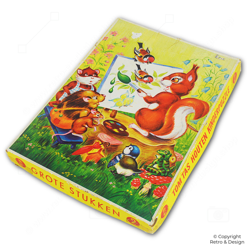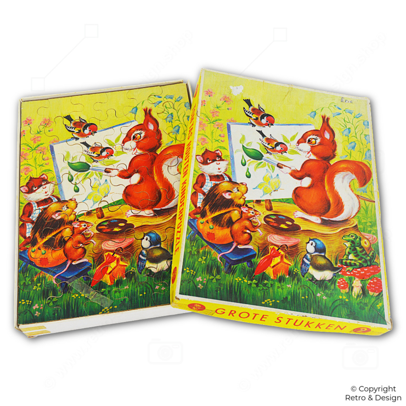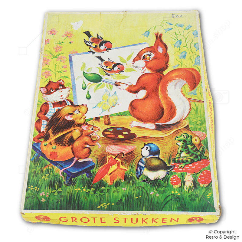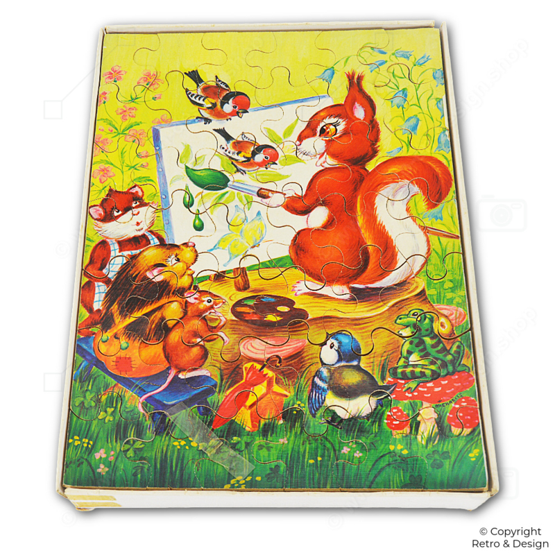 Este rompecabezas de madera representa un idílico escenario forestal donde la ardilla actúa como artista. En su caballete trabaja en un cuadro mientras un erizo, un ratón, un pájaro y una rana lo observan con curiosidad. Los colores cálidos y el estilo de ilustración juguetón lo convierten en un ejemplo clásico de los juguetes infantiles nostálgicos de mediados del siglo XX.
