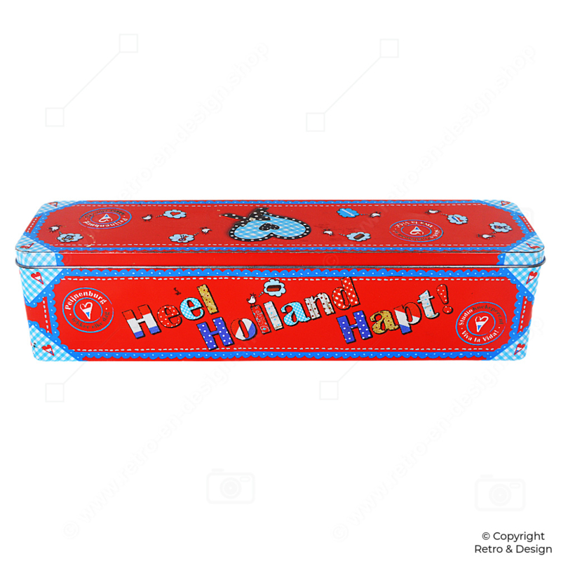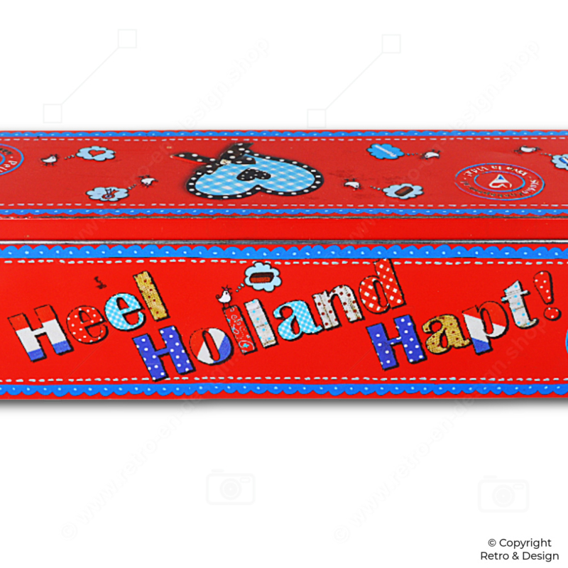 Esta lata colorida combina la tradición con un diseño juguetón. La base roja intensa se realza con los colores clásicos de los Países Bajos y el eslogan “Heel Holland Hapt”. Está pensada para guardar una hogaza entera de pan de jengibre, pero también es perfecta para galletas, caramelos u otros dulces. Además, queda genial como pieza decorativa en la encimera o en una estantería abierta.