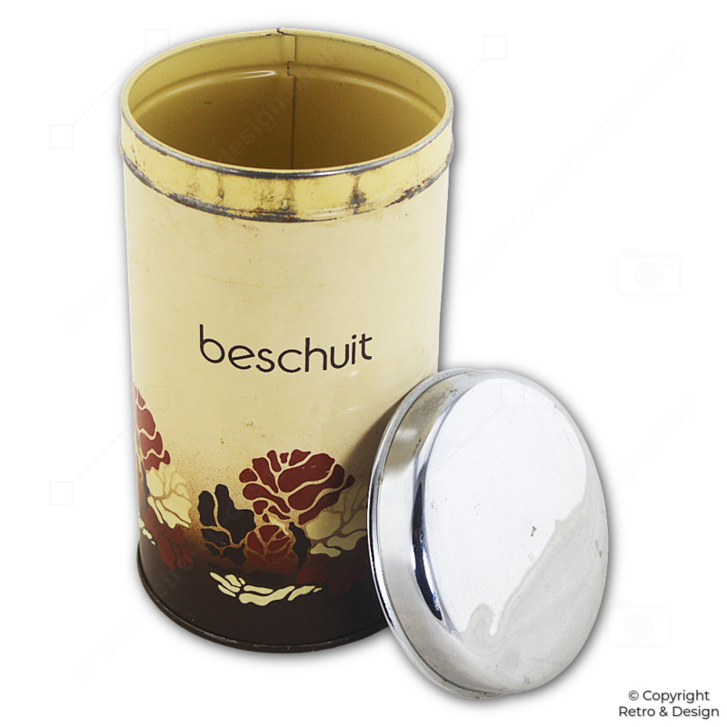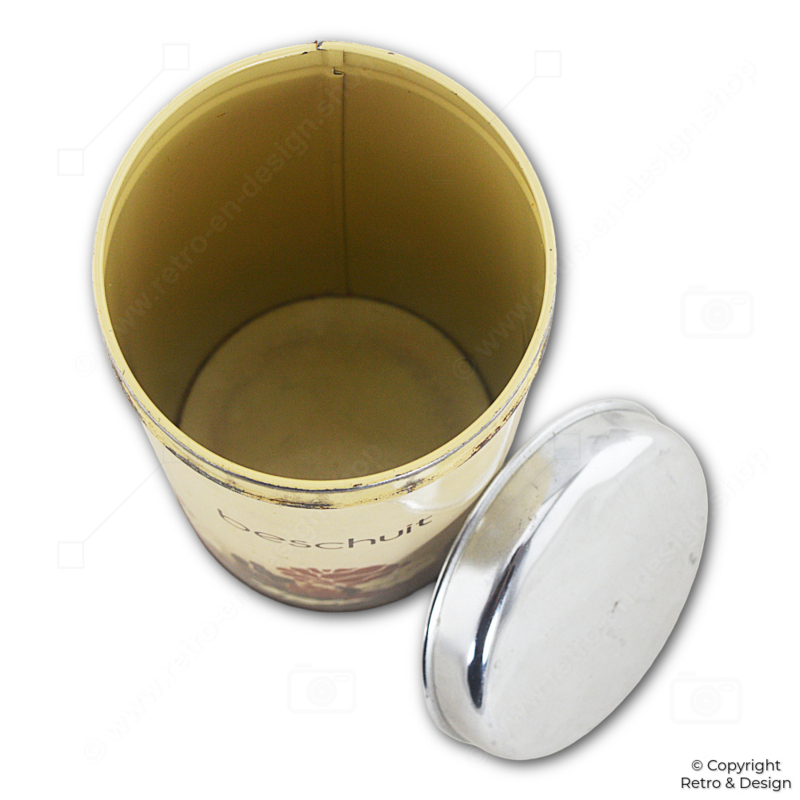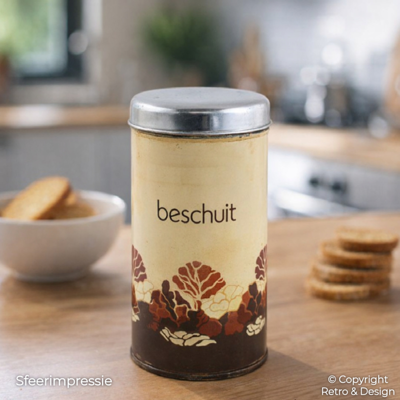 Esta elegante lata de galletas presenta la querida decoración Batique, un refinado patrón floral que refleja perfectamente el estilo cálido de los años 70. El sutil texto “beschuit” en el frente realza su auténtico aspecto vintage.