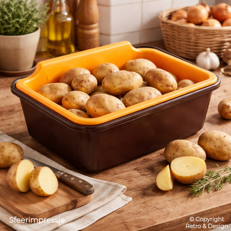 Las ranuras de ventilación garantizan una buena circulación de aire, ayudando a mantener las patatas frescas durante más tiempo y reduciendo el riesgo de deterioro. Un detalle especialmente ingenioso es la tapa reversible: al girarla, se convierte en un práctico cuenco para pelar patatas. Durante el uso, se mantiene estable tanto sobre las piernas como sobre la encimera.
