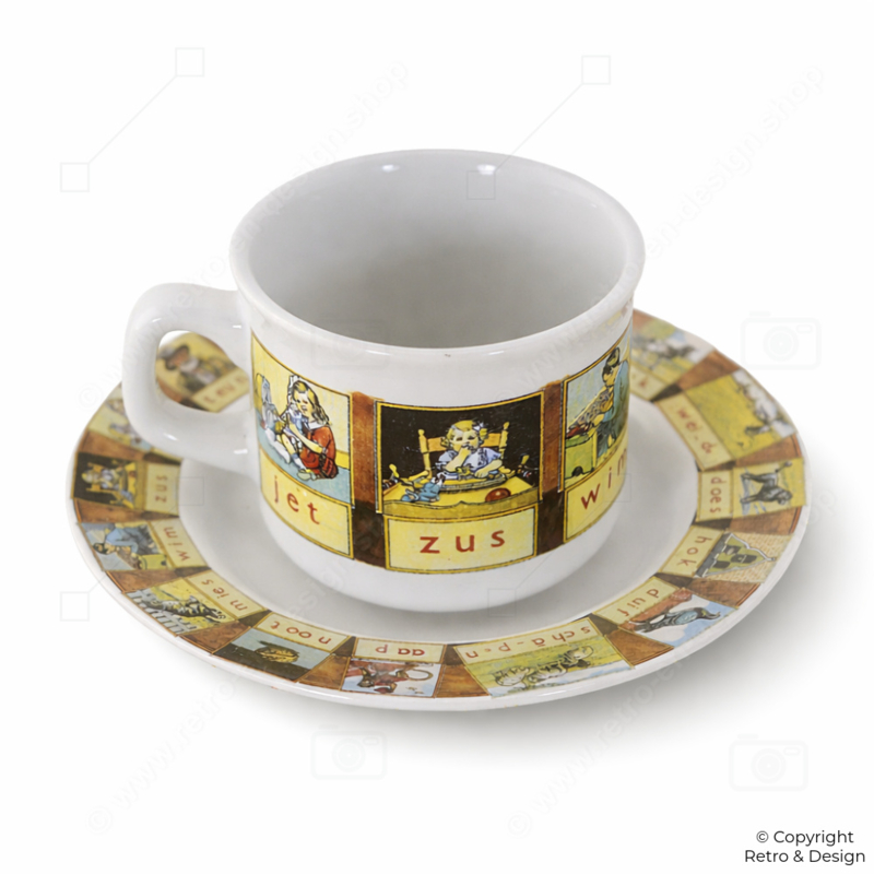 • Taza y platillo de estilo nostálgico con ilustraciones del conocido tablero de lectura neerlandés “Aap, noot, mies”