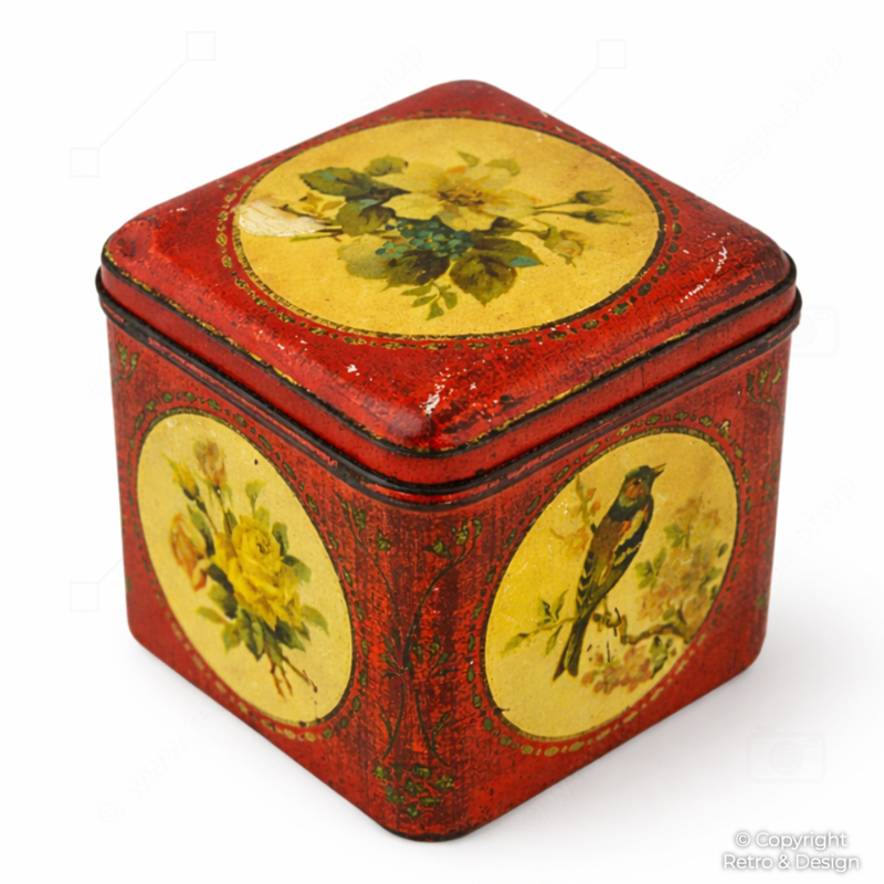 Encantadora lata vintage de forma cúbica con románticos motivos de aves y flores en medallones decorativos. Una pieza tanto decorativa como funcional con un cálido aire nostálgico.