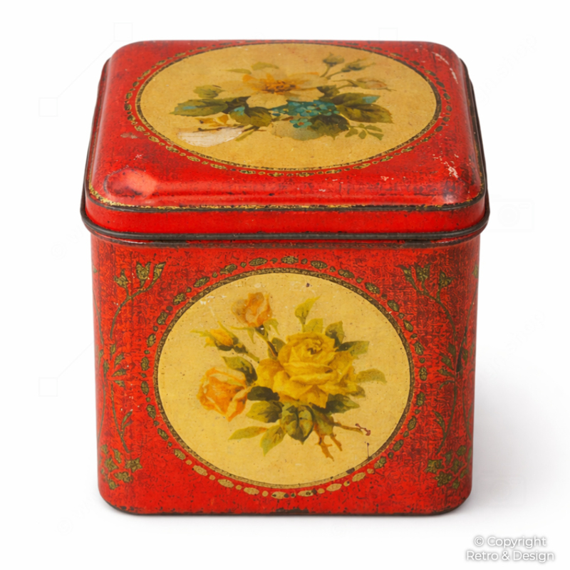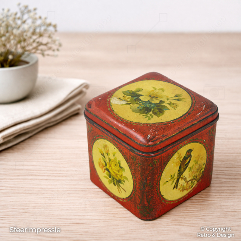 Lata Vintage Cúbica Roja con Motivos de Aves y Flores – Caja Decorativa Metálica – Holanda (1950–1970)