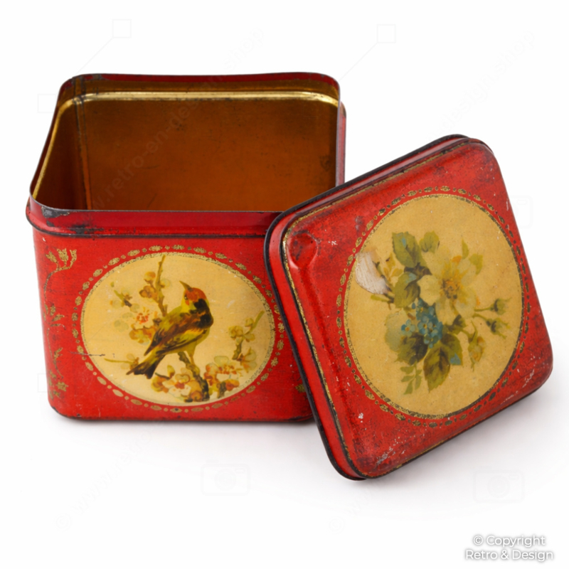 Esta lata destaca de inmediato por su cálido color rojo combinado con refinados detalles dorados. Los medallones circulares con un pájaro posado en una rama en flor, junto con los motivos florales, le confieren un aspecto nostálgico y ligeramente romántico.