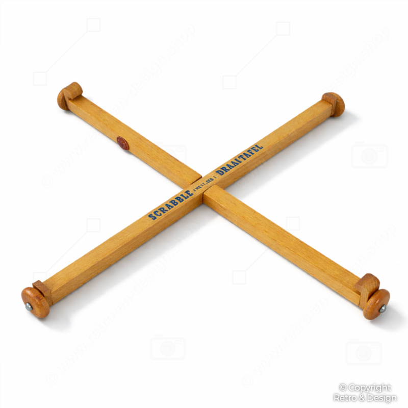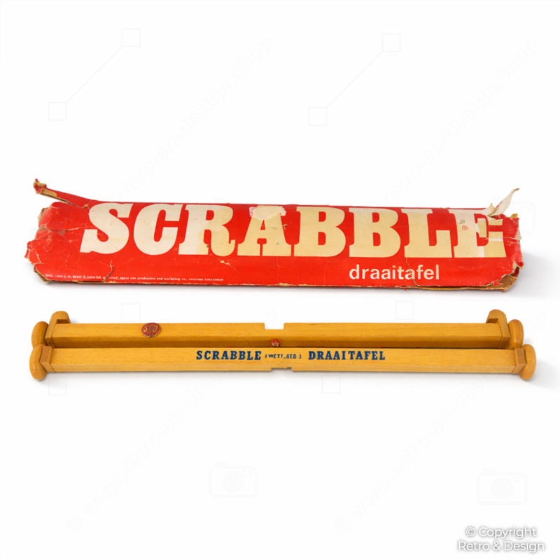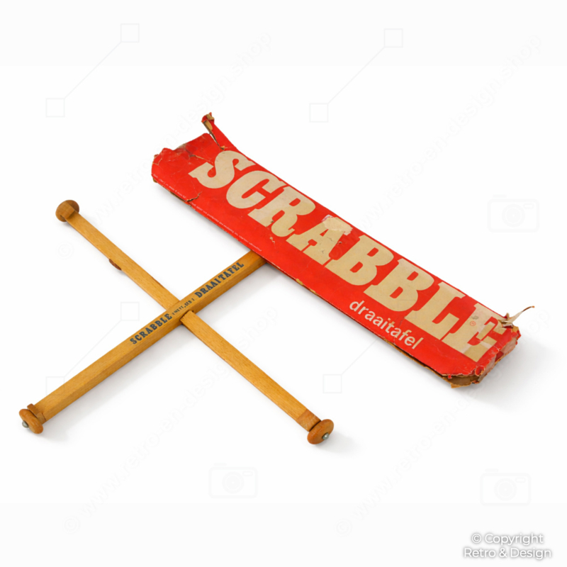 Singular base giratoria vintage de Scrabble de 1957, fabricada en madera y conservada en su tubo original de cartón. Un accesorio raro y funcional, ideal para coleccionistas de juegos de mesa vintage.