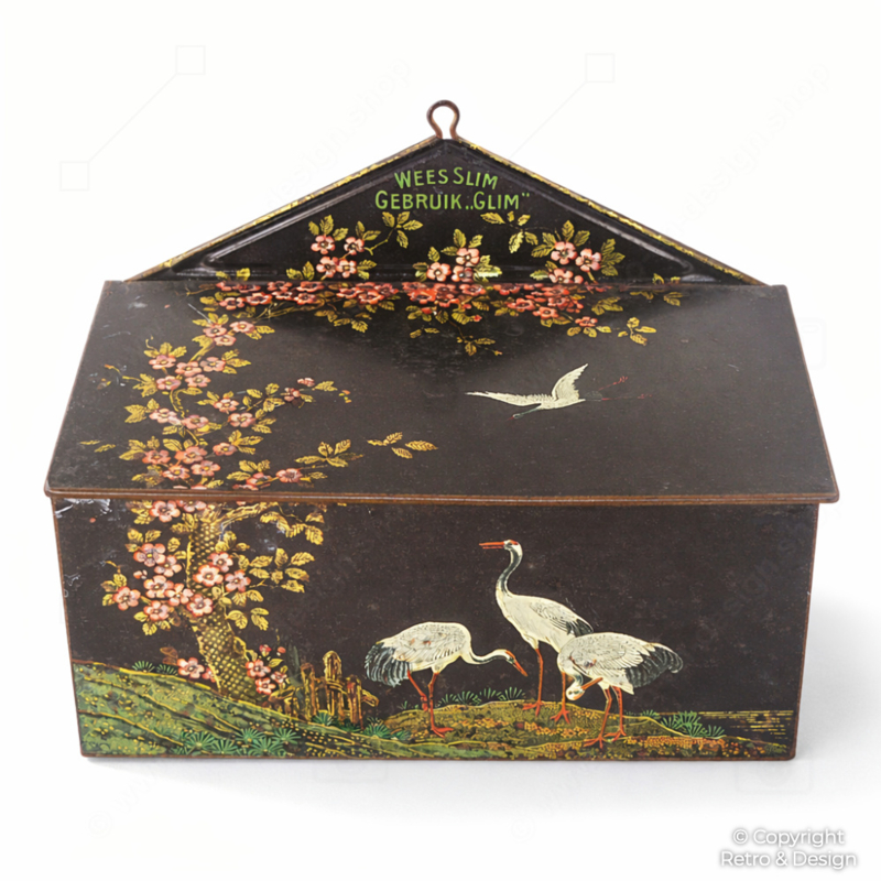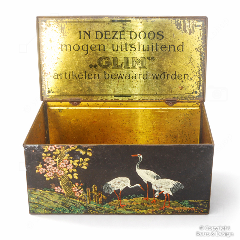 La decoración con grullas, ramas en flor y farolillos le confiere una marcada estética oriental. En los laterales aparece la marca “GLIM”, mientras que el interior de la tapa conserva el texto original en neerlandés: