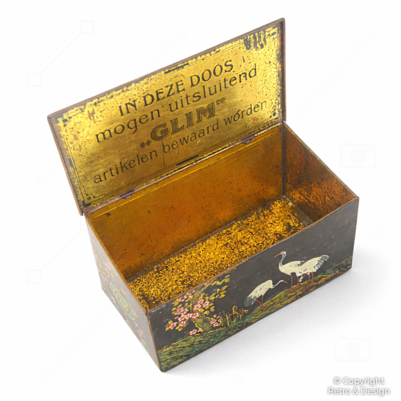 Rara caja de pulimento Glim lacada en negro, decorada con elegantes motivos de estilo oriental con grullas, flores y farolillos. Una pieza con mucho carácter y encanto, representativa de la publicidad neerlandesa del periodo de entreguerras.