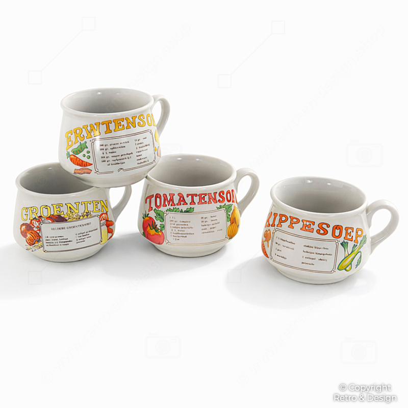 Cada taza presenta su nombre original de sopa en neerlandés y una receta impresa, aportando un auténtico encanto nostálgico y convirtiendo este conjunto en un magnífico ejemplo de la vajilla de cocina neerlandesa de los años 70.