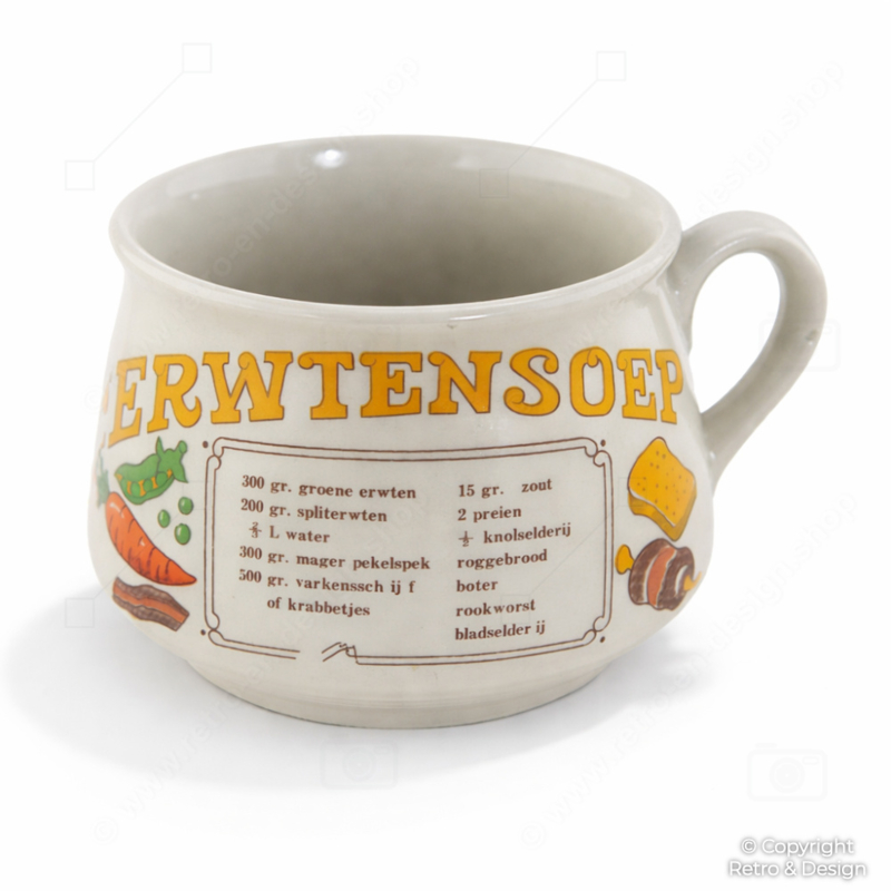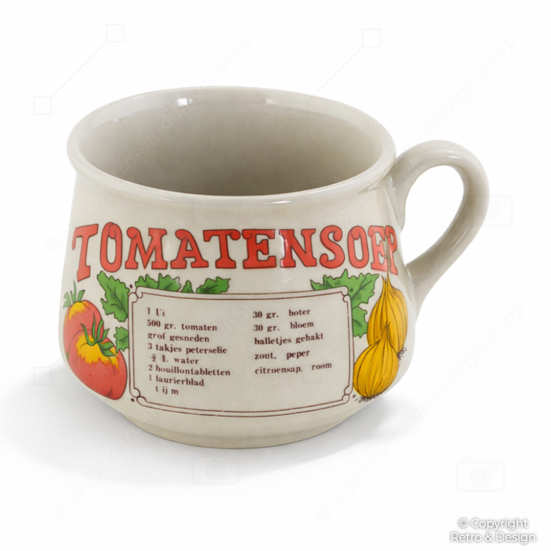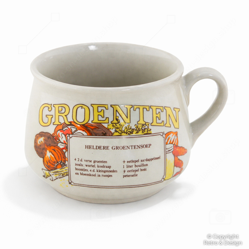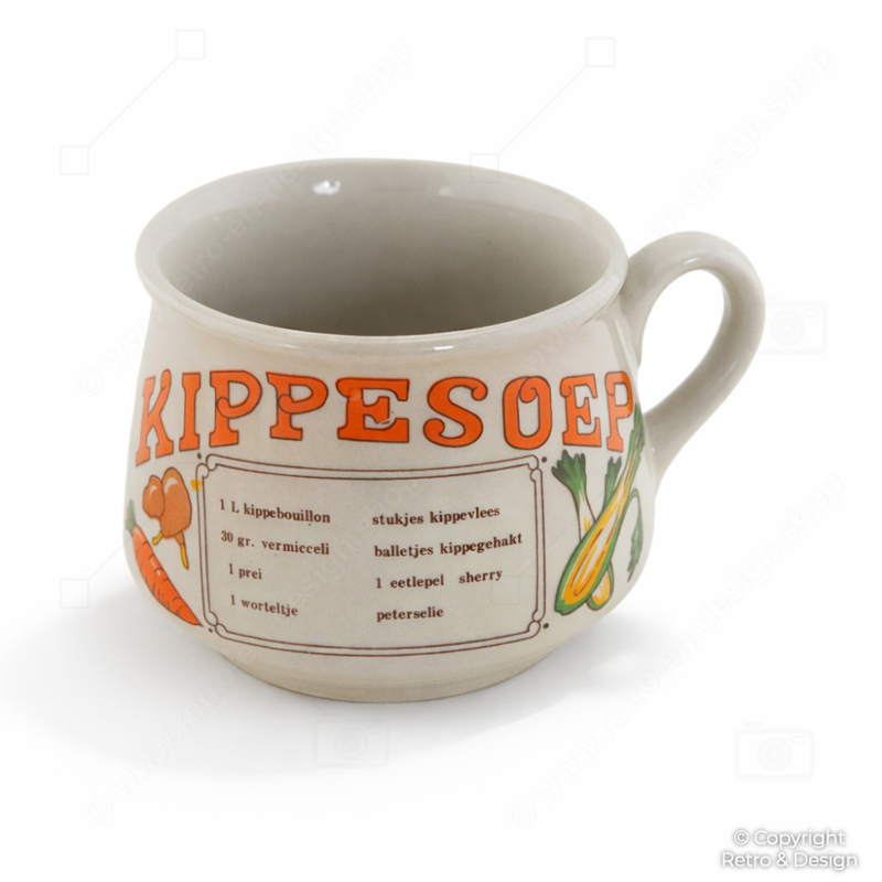 Las tazas soperas decoradas con recetas como estas fueron muy populares en los hogares neerlandeses durante los años 70 y reflejan el diseño de cocina alegre y práctico de la época. La combinación de tipografía, ilustraciones y funcionalidad las convierte en ejemplos muy reconocibles de la nostalgia vintage de cocina neerlandesa.
