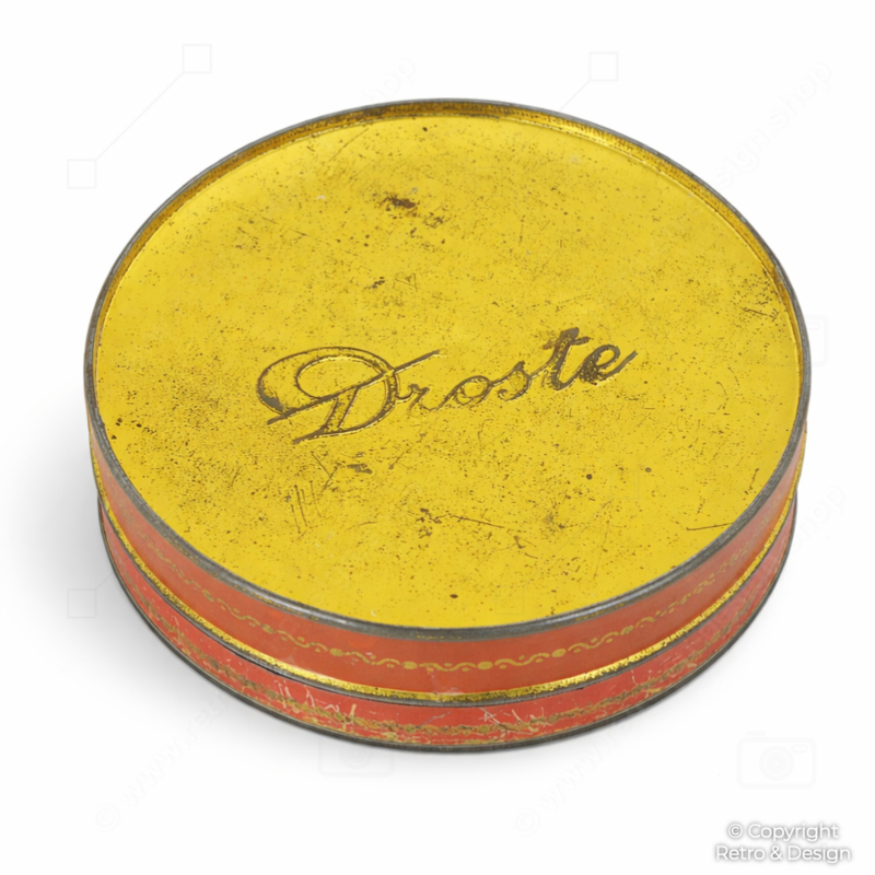Esta lata redonda de Droste destaca inmediatamente por su tapa floral ricamente decorada en relieve y su cálida paleta cromática. La combinación de rojo, dorado y motivos florales le confiere una apariencia muy decorativa con sutiles influencias de inspiración oriental.