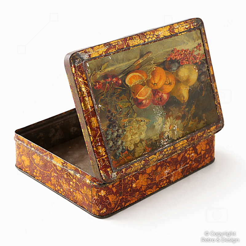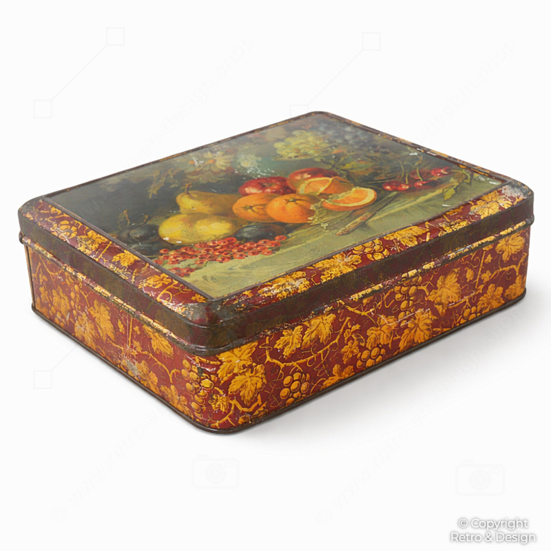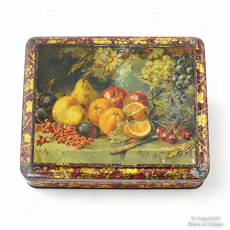 Esta característica lata de almacenaje se utilizaba originalmente como envase de lujo para galletas, pastas u otras delicadezas. Gracias a su diseño decorativo y su clásica naturaleza muerta de frutas, hoy en día es especialmente apreciada como pieza de colección y decoración.
