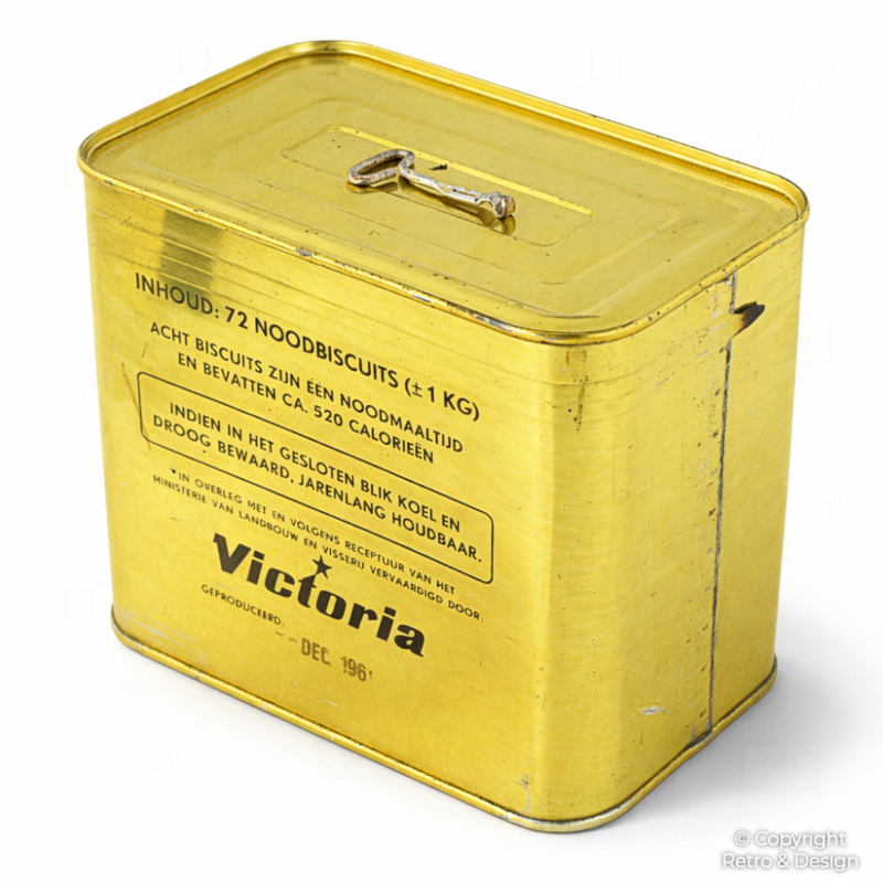 Original lata neerlandesa de galletas de emergencia de la Guerra Fría de Victoria, fechada en 1961, aún sellada y completa con su contenido original y abridor. Una notable pieza histórica de colección vinculada directamente a las reservas civiles de emergencia de los Países Bajos durante la tensa época de la Guerra Fría.