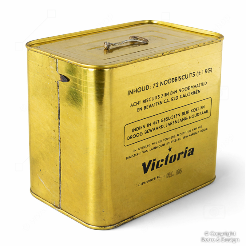 Victoria produjo estas latas en cooperación con y según las especificaciones del Ministerio neerlandés de Agricultura y Pesca. Formaban parte de los programas de reservas civiles de emergencia de los Países Bajos durante la Guerra Fría, cuando se fabricaban y almacenaban raciones de emergencia como medida de precaución ante posibles situaciones de crisis.