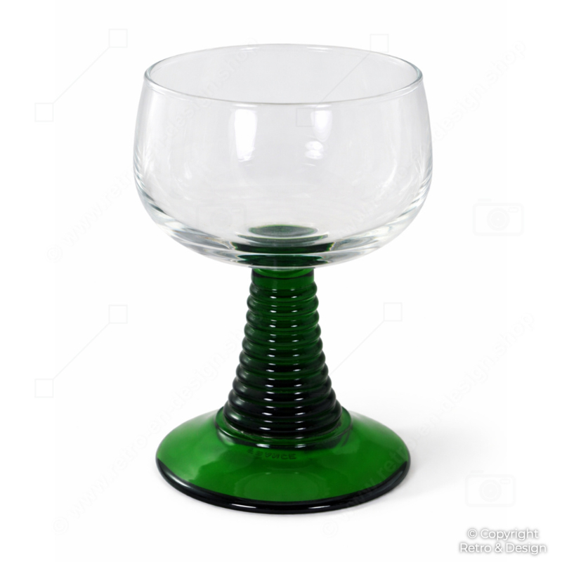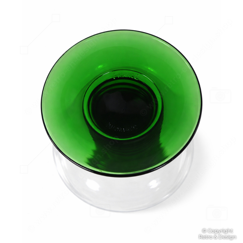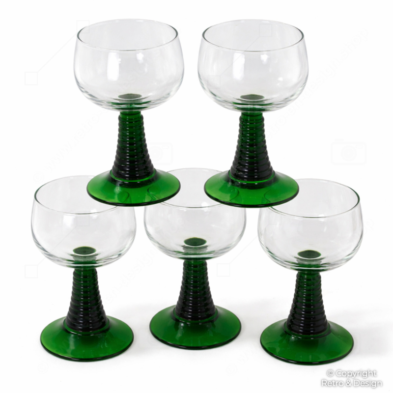 Elegante conjunto de cinco copas vintage Luminarc tipo römer con cáliz de vidrio transparente y distintivo tallo acanalado en color verde. Un refinado diseño francés de los años 70/80, perfecto para servir aperitivos, vino de postre, oporto, jerez o pequeñas porciones de vino, muy apreciado por su llamativa estética retro.