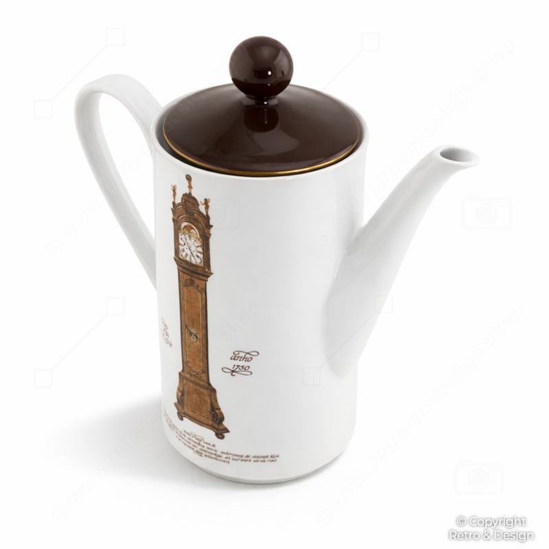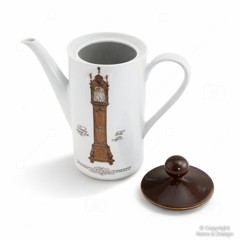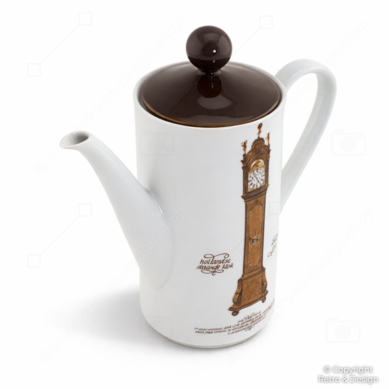 Original tetera / cafetera de porcelana del conocido servicio de relojes de Nutroma, producida por Mitterteich Porzellan en los años 70. Esta nostálgica cafetera presenta en ambos lados una decoración de un tradicional reloj de pie holandés fechado en 1750 y evoca de inmediato el encanto de la clásica vajilla de café neerlandesa de la época.