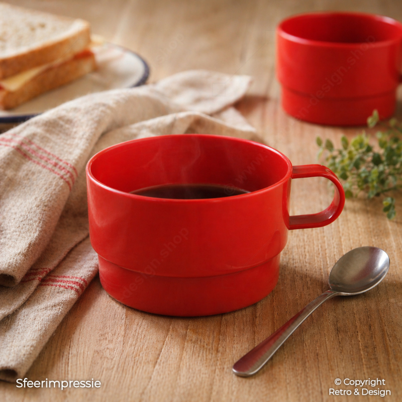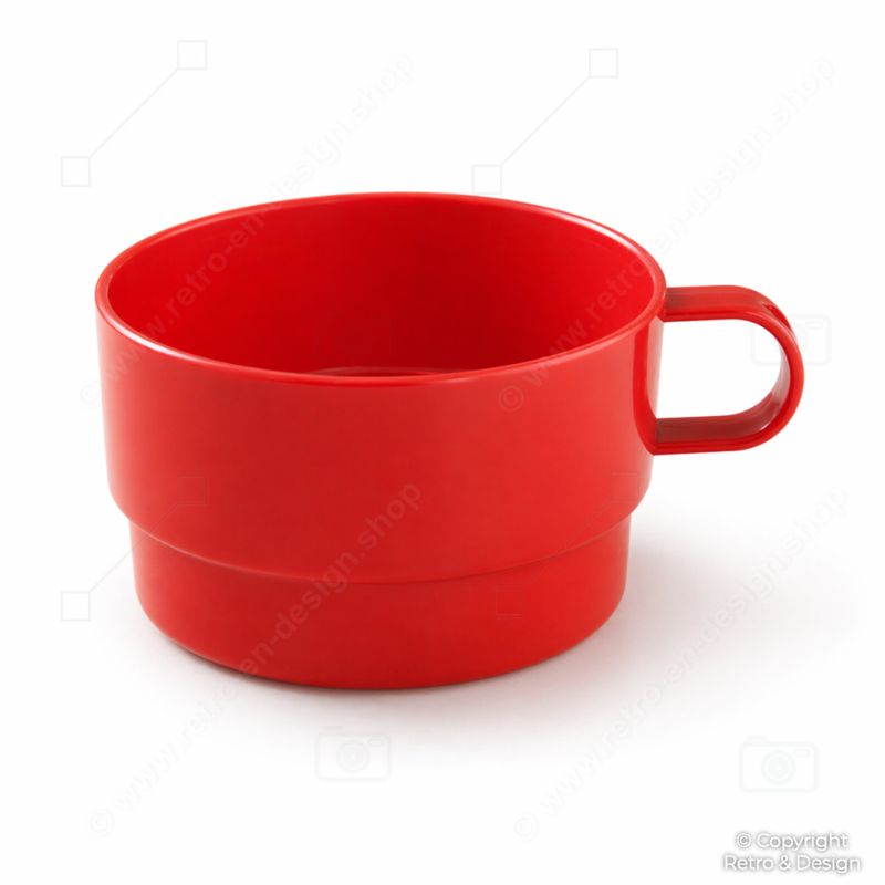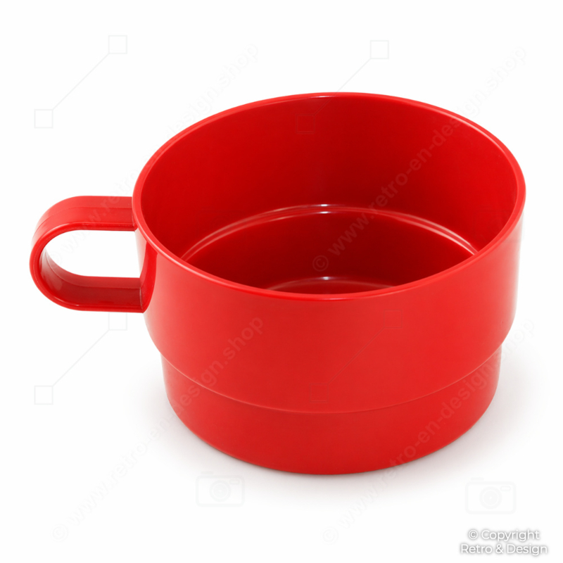 Conjunto de 5 cuencos vintage de plástico con asa de Mepal (modelo 421). Acabados en un llamativo color rojo y diseñados para apilarse. Ideales para sopa, aperitivos o uso en camping.